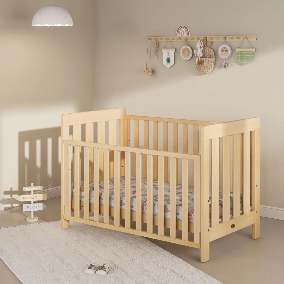Prioritising both beauty and function, the cot is adorned in our nursery-friendly Barley White finish. This sought-after hue seamlessly fits into any nursery theme, complementing a range of decors. For a harmonious nursery set-up, consider pairing this white cot with our enduring solid wood Toy Box.