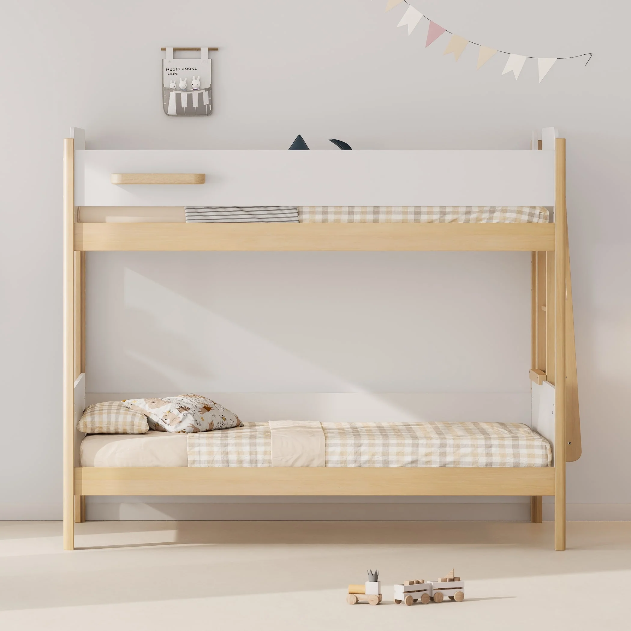 The Natty King Single Bunk Bed features a contemporary two-tone design. It's ideal for Scandinavian-inspired interiors and includes a handy little shelf to keep items close by. The ladder is compact to take up minimal floor space.