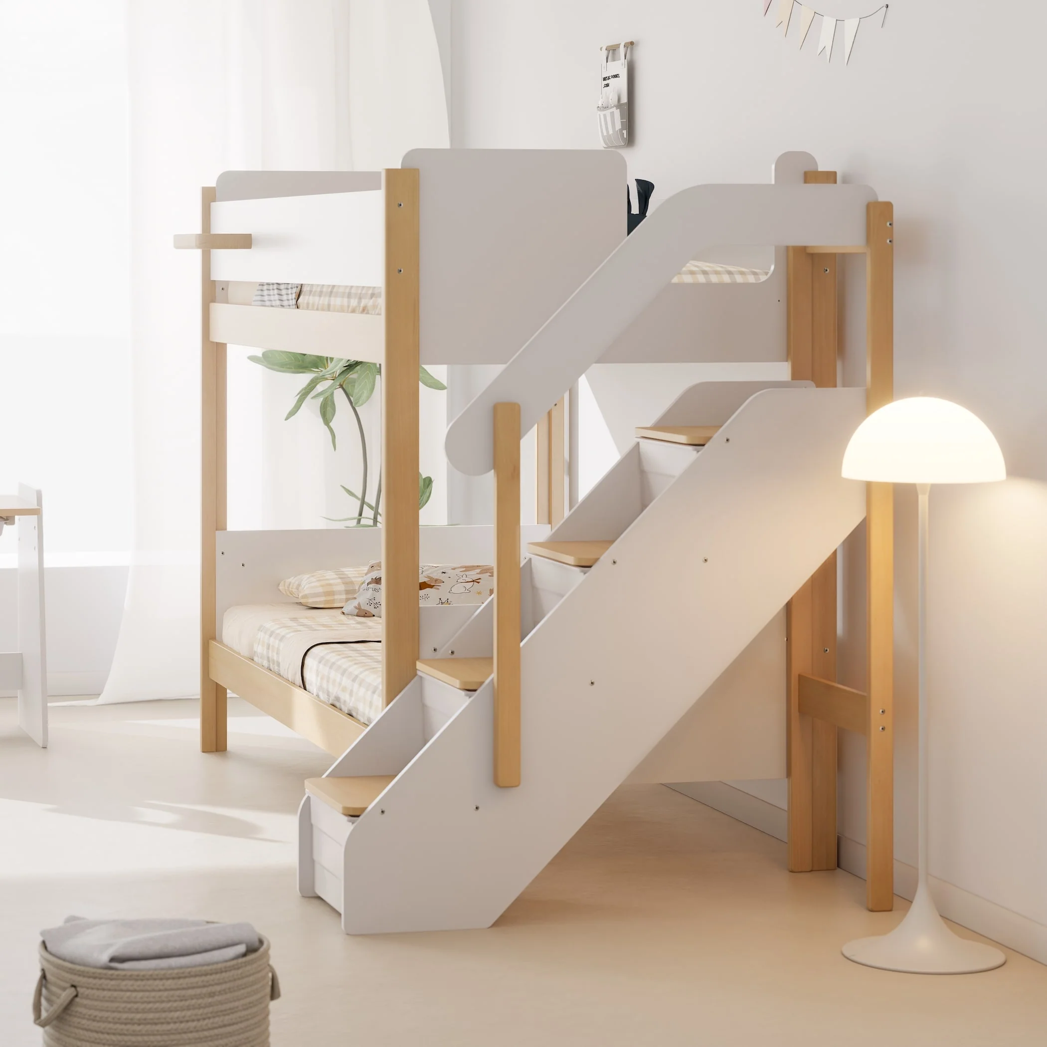 The Natty King Single Bunk Bed features a contemporary two-tone design. It's ideal for Scandinavian-inspired interiors and includes a handy little shelf to keep items close by, as well as a storage staircase complete with plastic storage tubs perfect for keeping your child's bedroom neat and tidy.