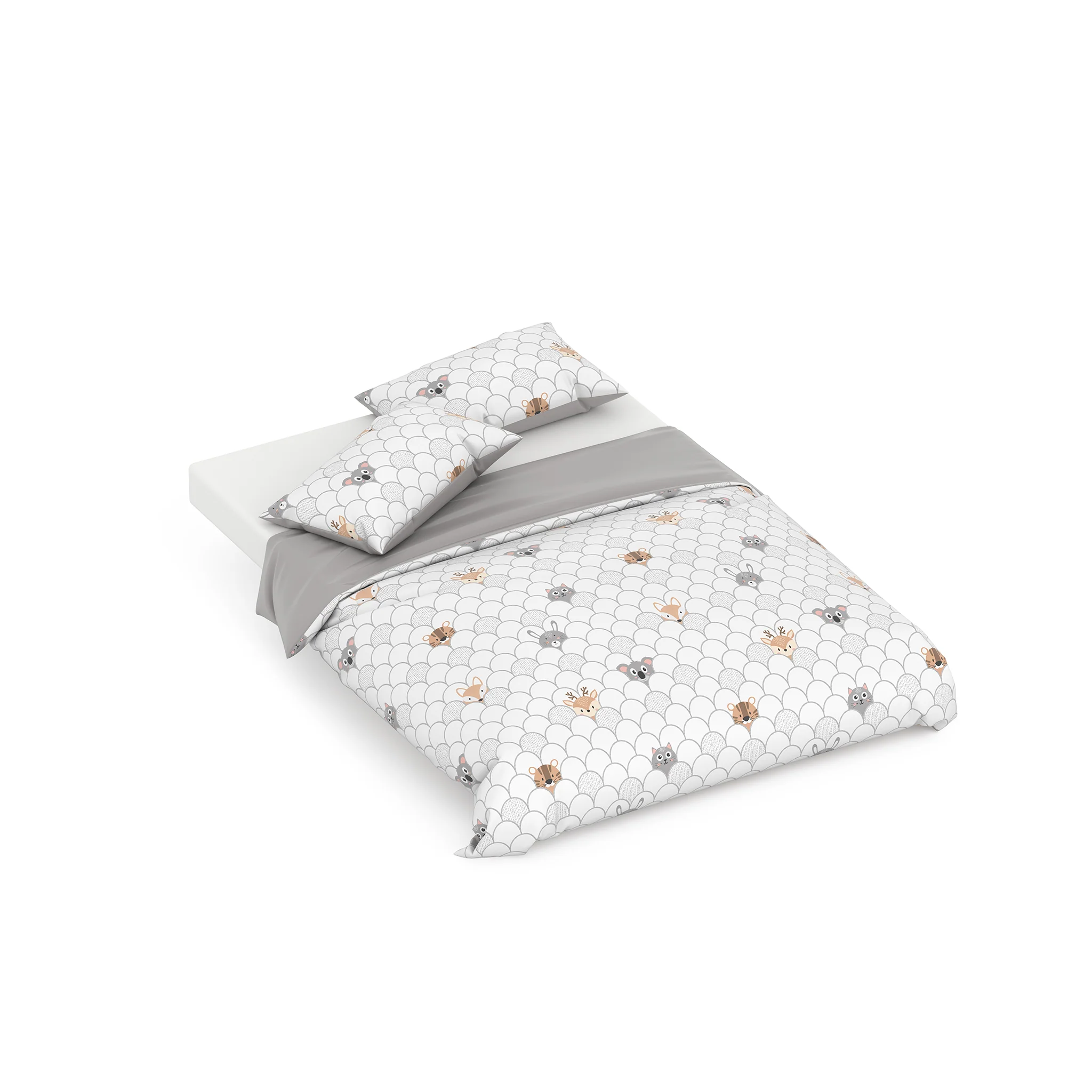 Transform your child's bedroom into a whimsical escape with our Peek-a-Boo Quilt Double Cover Set! This design features a gender-neutral white and grey background, with adorable animals like a koala, cat, tiger, rabbit, and deer playfully peeking out, adding a touch of playfulness and charm.